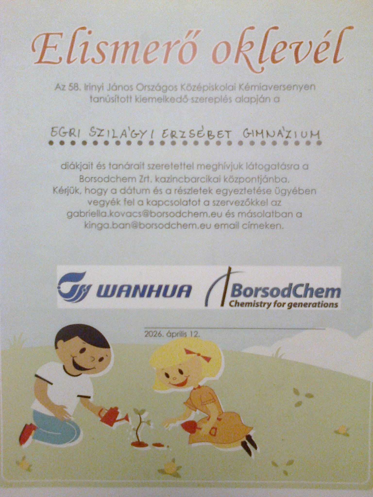 A Pécsen megrendezett 58. Irinyi János Országos Középiskolai Kémiaverseny döntőjében dicséretesen szerepeltek az iskolánk tanulói. A diákoknak egy150 perces írásbeli feladatsor kellett kitölteni, melyben elméleti és számolási feladatok is voltak, majd 120 perces laborgyakorlat következett. A jól végzett munka után jutott egy kis idő, hogy Pécs belvárosában is sétáljanak. Igazán büszkék lehetünk, mivel nagyon szép eredményeket értek el. Teljesítményük alapján pedig lehetőséget kaptunk a Borsodchem Zrt. kazincbarcikai központjába egy gyárlátogatásra. Dargai Máté elismerő oklevelet is kapott kimagasló eredményéért.