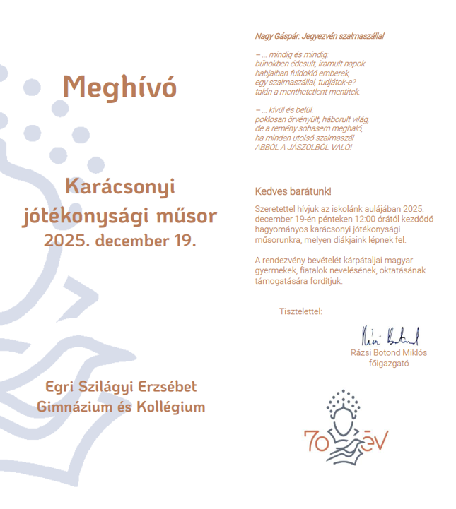 A készpénz adományokat a gimnázium gazdasági irodája gyűjti. Utalás esetén a számlaszám: OTP Bank 11739009-20106603. A közlemény rovatba kérjük feltüntetni: karácsonyi műsor. Minden adományt köszönünk, mert jót tenni jó!