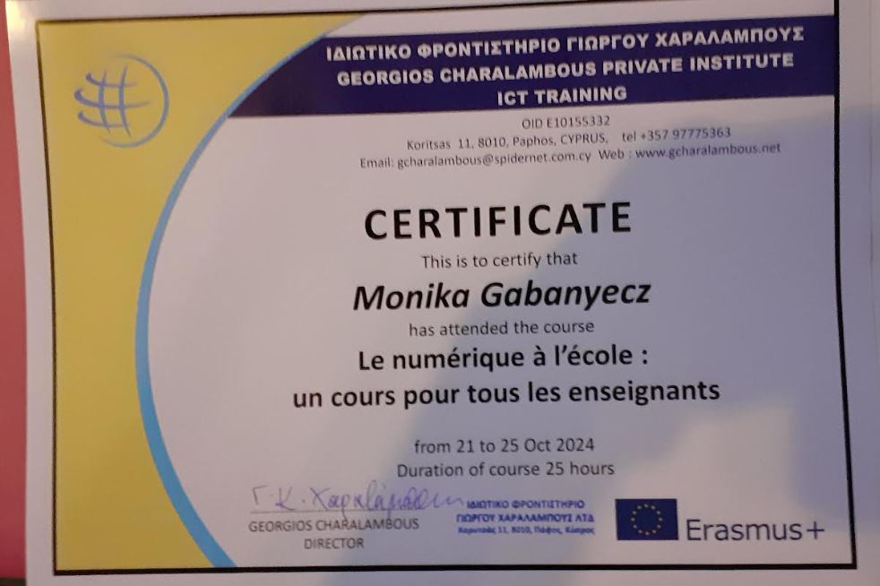 Gabanyecz Mónika tanárnő az Erasmus-ösztöndíj segítségével egy nagyon hasznos és érdekes kurzuson vehetett részt 2024. október 2. és 25. között Cipruson, Paphos városában. A fókusz azon volt, hogyan élhetünk tanárként a digitális lehetőségekkel. A tanfolyam során azt fedezte fel lépésről-lépésre, hogy tanárként hogyan használhatja az internetet és a mesterséges intelligenciát. Mivel ő volt a képzés egyetlen résztvevője, így igazán intenzív volt ez az öt nap. A tananyagon kívül megismerhette Ciprus történelmét, bepillantást nyerhetett Paphos kultúrájába, megcsodálhatta nevezetességeit. Magyartanárként különösen nagy élmény volt számára az ókori görög mitológiából jól ismert Aphrodité nyomába szegődni, és megismerni, hogyan ápolják kultuszát a szigeten. (Ciprust Aphrodité földjének is nevezik, hiszen a mitológia szerint a város alatt húzódó tengeröbölben a habokból kiemelkedve és egy kagylóhéjban a partra evezve jött világra a szépség és szerelem istennője, Aphrodité.)
