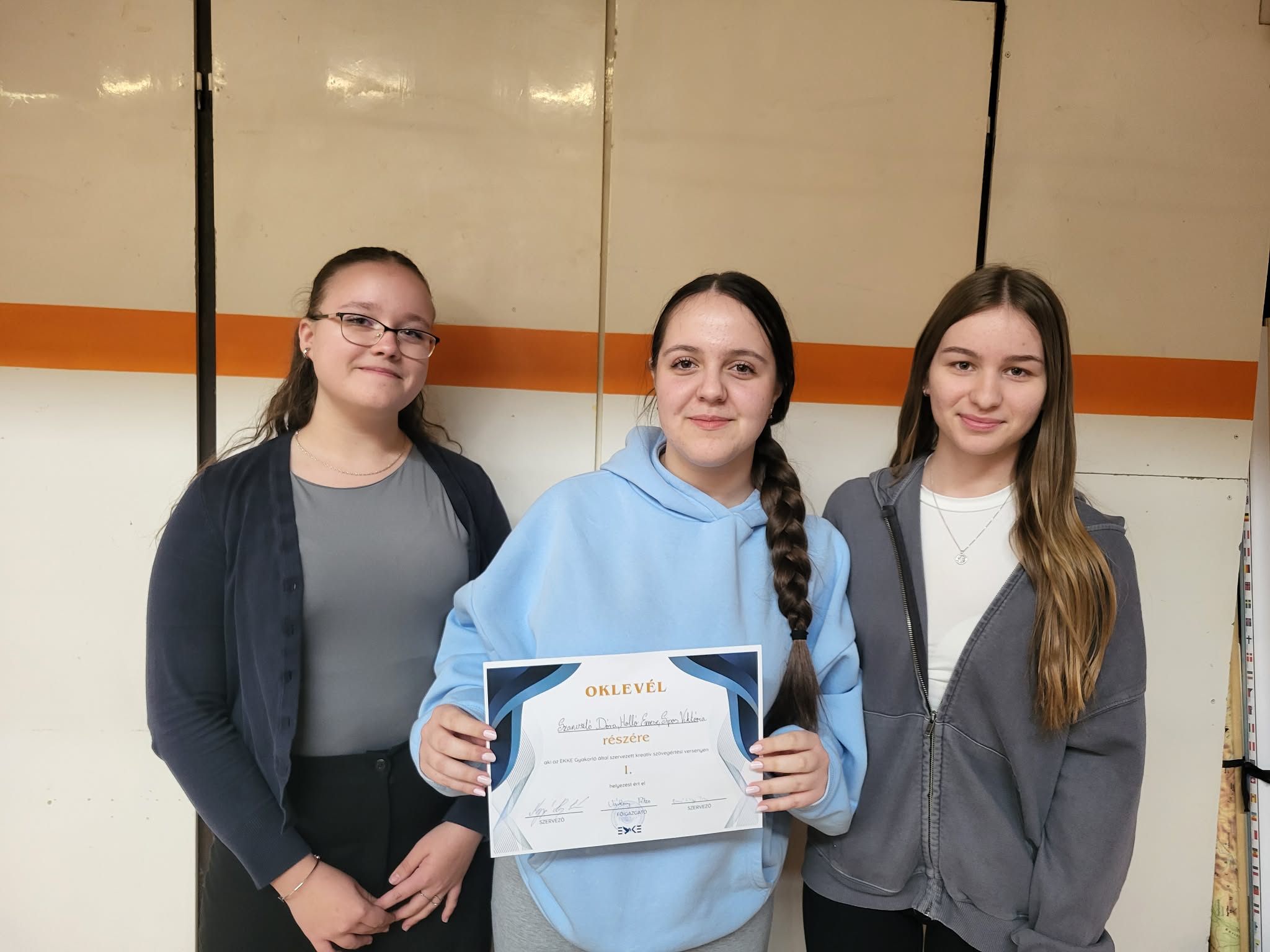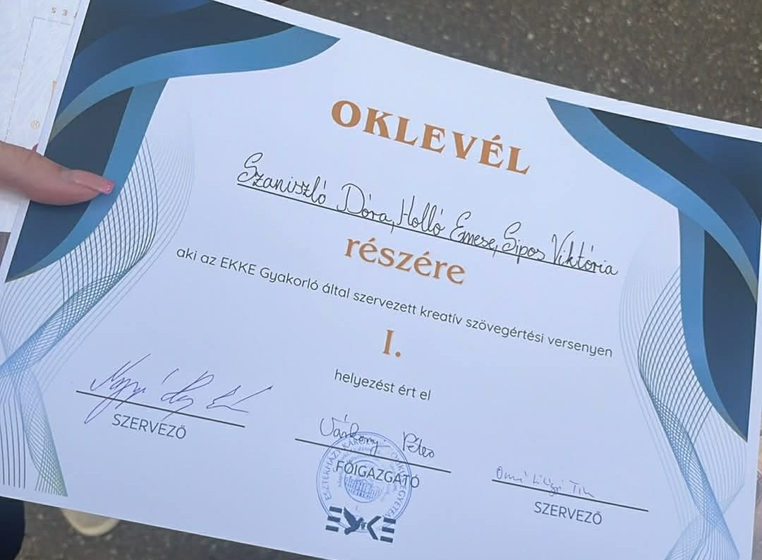 Az Eszterházy Gyakorló által rendezett kreatív szövegértési versenyen iskolánk csapata (Holló Emese, Sipos Viktória, Szaniszló Dóra 9.a) 1. helyezést ért el. Felkészítő: Joó Balázs. Gratulálunk!